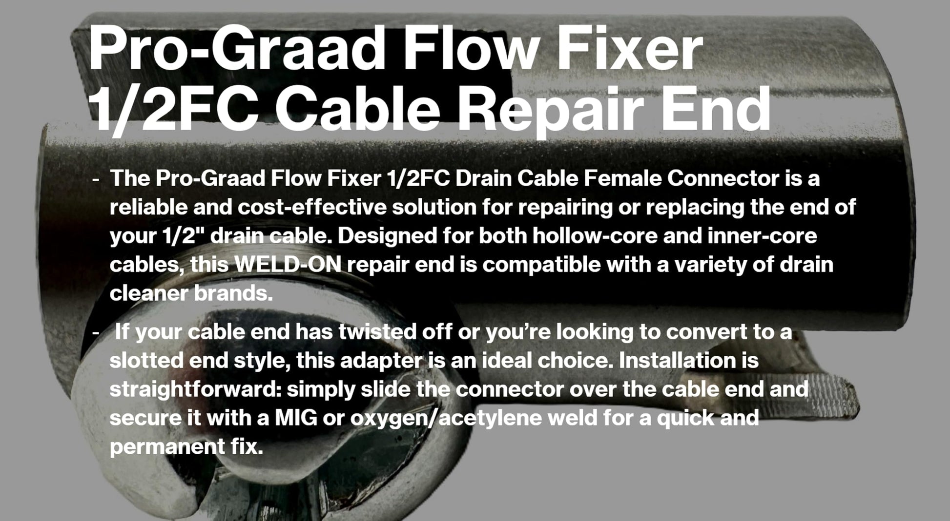 The Pro-Graad 1/2FC Flow Fixer is the professional plumber’s solution for repairing broken 1/2” drain cleaning machine cables without the high cost of full replacement. Designed as a weld-on female slotted connector, this repair end quickly restores functionality to your drain cable, keeping your equipment job-ready and minimizing downtime. When a cable end twists off or becomes damaged, replacing the entire cable can be expensive and time-consuming. The Flow Fixer offers a quick and permanent weld-on repair that saves both time and money. Simply slide the connector onto your 1/2” O.D. cable and secure it using MIG welding or oxygen/acetylene welding for a durable, long-lasting fix you can trust in the field. Engineered for universal compatibility, this repair end works with both hollow-core and inner-core drain cables and is suitable for leading drain cleaner brands including General, Cobra, Speedway, and Harbor Freight’s Hydrostar. Whether you need to repair a broken end or switch to a slotted connector, the Flow Fixer is built to handle tough jobs with reliability and strength. Crafted from high-quality materials, the Pro-Graad Flow Fixer delivers the durability and professional performance plumbers demand. It’s an essential repair accessory for every drain cleaning toolkit, ensuring you stay productive on the job without costly delays. Get your drain cable back in action with the Pro-Graad 1/2FC Flow Fixer weld-on repair end—a cost-effective, heavy-duty solution for professional plumbers.