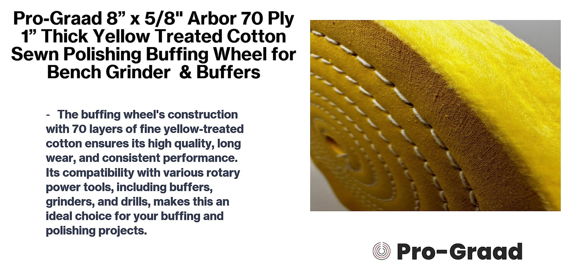 The Pro-Graad 1 Pack Extra Thick Yellow Treated Cotton Buffing Polishing Wheel is a high-quality wheel designed for use in the middle step of the buffing process. The package includes one 8-inch wheel with a 5/8 inch arbor hole and 70 layers of yellow treated cotton. It is 1 inch thick and features a 1/2 inch concentric sewn stitching. This buffing wheel is ideal for removing remaining scratches and achieving a smooth surface before moving on to the final polish. The yellow treatment of the cotton provides a more aggressive buffing action, making it suitable for use with Tripoli compound or other light abrasive compounds. The wheel is versatile and can be used for light to medium cutting on various materials such as aluminum, stainless steel, brass, cast iron, and auto body parts. Its yellow treatment gives it a firmer and more durable texture, enabling efficient cleaning, scratch removal, and oxidation removal. It is ideally suited for applications in automotive restoration, metalworking, woodworking, and jewelry finishing. The construction of the buffing wheel using 70 layers of yellow treated cotton ensures high quality, long wear, and consistent performance. It is compatible with a range of rotary power tools, including buffers, grinders, and drills, making it suitable for a variety of buffing and polishing projects. It is important to prioritize safety while using the buffing wheel. Always wear appropriate protective gear for the eyes, ears, face, body, and respiratory system to prevent any potential injuries or health hazards.