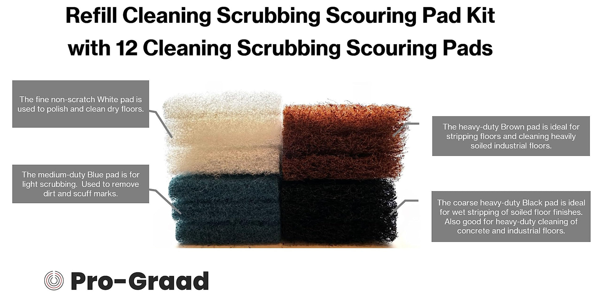 The Pro-Graad versatile 12 piece Refill Cleaning Scrubbing Scouring Pad Kit with 3x of 4 Different 4.5" x 10" Utility Cleaning Scrubber Scouring Pads (White Blue Brown Black) is designed to tackle a wide range of cleaning tasks, ranging from gentle cleaning of delicate surfaces to tough scrubbing of dirt and buildup on floors. It can be utilized in areas that cannot be accessed by a regular floor machine, such as corners, baseboards, stairs, and other similar surfaces. The Pro-Graad 12 piece Refill Kit includes: 12x Utility Cleaning, Scrubbing, Scouring Pads. Pads include 3x White Light-Duty Cleaning Pads, 3x Blue Medium-Duty Scrubbing Pads, 3x Brown Heavy-Duty Scouring Pads, 3x Black Heavy-Duty Scouring Pads. [PLEASE NOTE: the Pad Holder is sold separately and is not included in this kit].