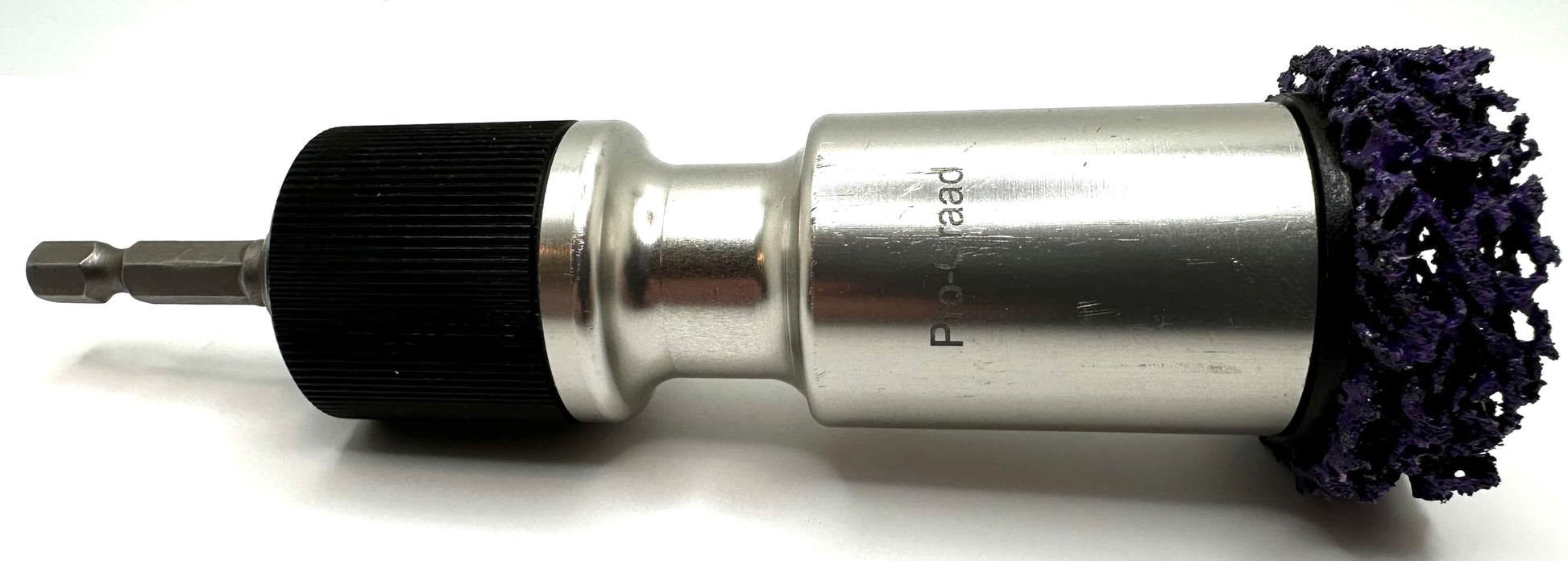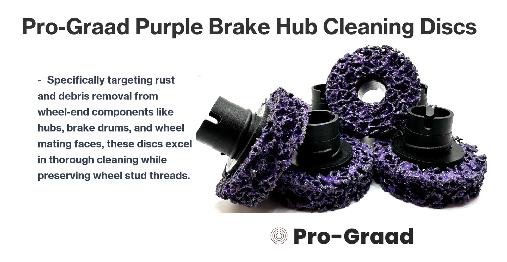 The Pro-Graad 7 Piece 1-1/2” Brake Hub Resurfacing Starter Kit offers a comprehensive solution for efficient brake hub maintenance. This kit is equipped with essential components including 5x Cleaning Pads, 1x Tool Holder, and 1x Drill Adapter, facilitating a hassle-free cleaning process. Inside the package, users will find a Tool Holder, a 1/4" Hex Shank Drill Adapter, and 5 Cleaning Pads measuring 1-1/2” in diameter. It's important to note that optimal performance is achieved when operated at speeds below 10,000 RPM and exclusively in the forward (clockwise) direction. Designed to be versatile, this kit boasts compatibility with 1/2" drive impact guns/wrenches. Additionally, the included 1/4” hex shank drill adapter extends its usability to cordless and power drills, ensuring flexibility in tool selection. The innovative hollow center design of the cleaning pads and tool holder ensures the safe maneuvering of the cleaning pads over and around the wheel studs, safeguarding the threads from any potential damage during use. Efficiency is key with this kit. It swiftly removes rust, corrosion, and debris without causing unnecessary material removal or surface damage, preserving the integrity of the wheel and brake hub mating surfaces. The cleaning pads are adept at preparing hub and wheel surfaces for installation, leaving them clean and ready for install. Tailored for automotive, SUV, light truck, utility trailer, UTV, and ATV applications, this kit offers quick and effective cleaning for wheel-end mating surfaces. Its pads are specifically engineered for hub cleaning and resurfacing, ensuring a thorough and reliable maintenance process. Users can count on this kit for an efficient and reliable brake hub cleaning experience.