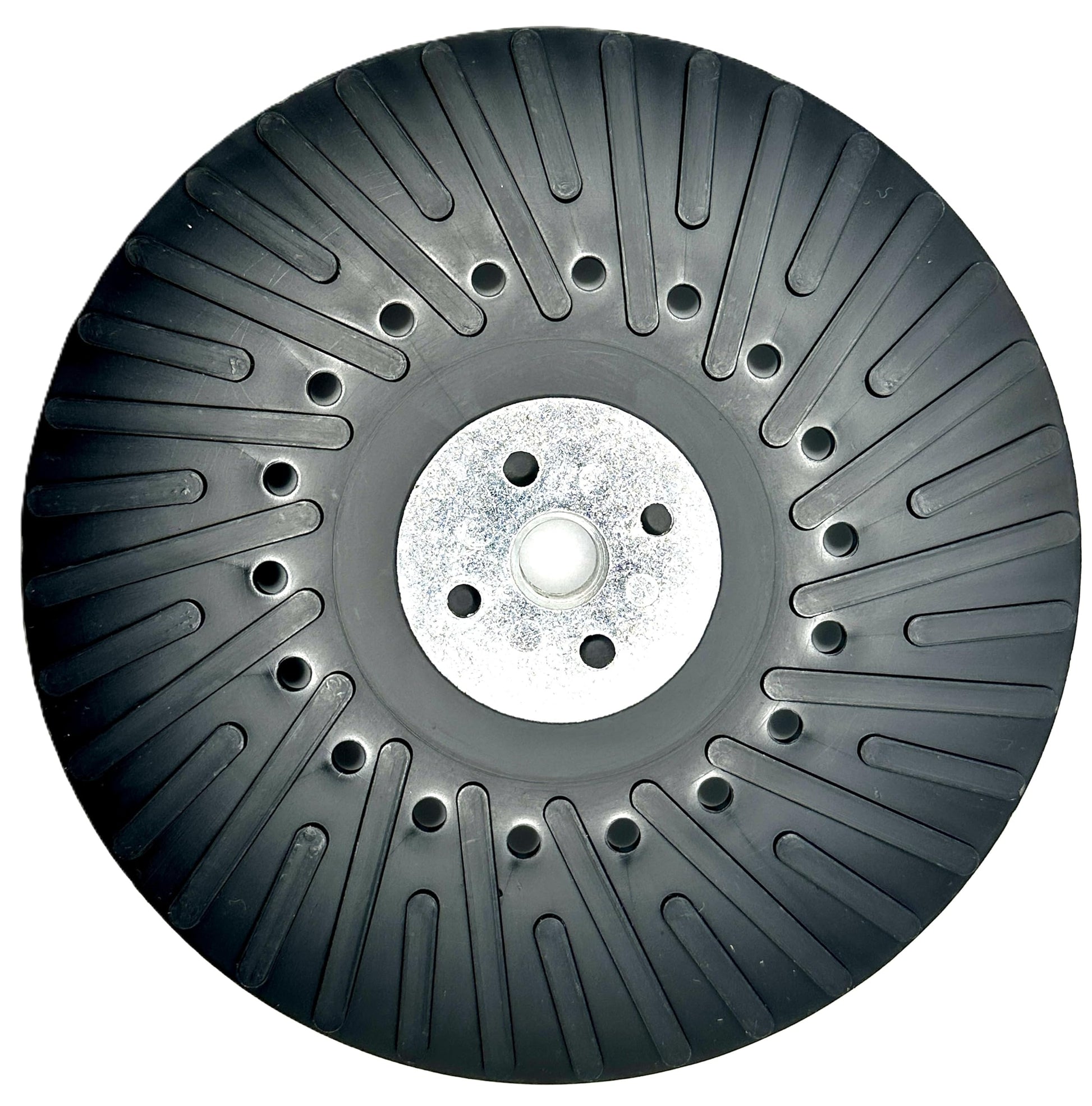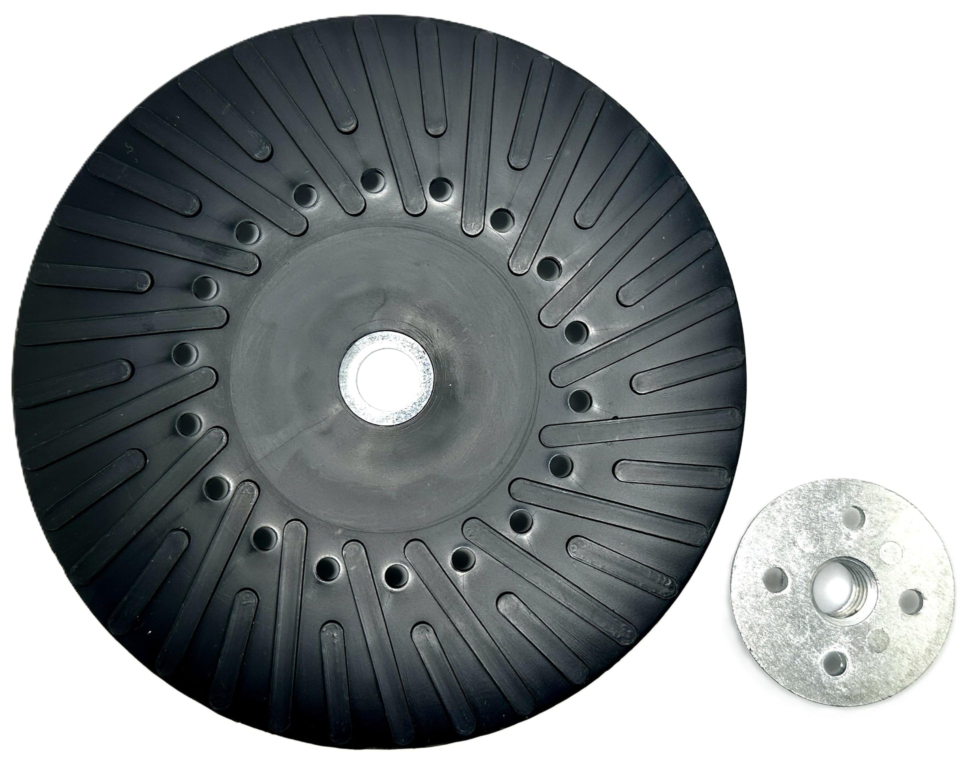 The Pro-Graad 7” Ribbed Rigid Resin Fiber Backing Pad is a high-performance solution for grinding, sanding, and stripping tasks on metal, wood, and more. Designed for use with resin fiber discs, this 7-inch sanding disc backer pad features a rigid polypropylene body paired with a cast zinc-alloy lock nut, offering durability and reduced weight compared to rubber alternatives. Its lightweight design supports high-RPM use while maintaining excellent strength and stability. Engineered with spiral-raised ribs and integrated airflow holes, the Pro-Graad backing pad maximizes cooling during operation. This advanced design helps prevent overheating, allowing resin fiber discs to last 30%–50% longer—boosting efficiency and reducing replacement costs. The pad includes a 5/8"-11 zinc-alloy locking nut for easy and tight attachment to all standard 7” angle grinders. It holds resin fiber discs firmly in place, preventing slippage and ensuring smooth, reliable performance even in demanding applications. Whether you're tackling coarse grinding, finishing, or aggressive surface prep, this versatile sanding backup pad delivers. It’s widely trusted across industries including construction, welding, fabrication, automotive, and shipbuilding. With standard 7” angle grinder compatibility, cooling innovation, and industrial-grade durability, the Pro-Graad 7” backing pad is the ultimate upgrade for professionals and serious DIYers alike. It's built to handle your toughest jobs while extending the life of your sanding discs—making it a must-have attachment for any angle grinder setup. NOTE: This is a hard, rigid backing pad—not flexible. If you need a flexible backer, this is not the right choice. Best suited for use with coarse/medium grades resin fiber discs in grinding and heavy material removal tasks.