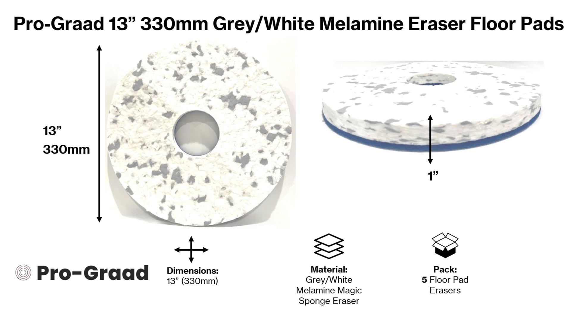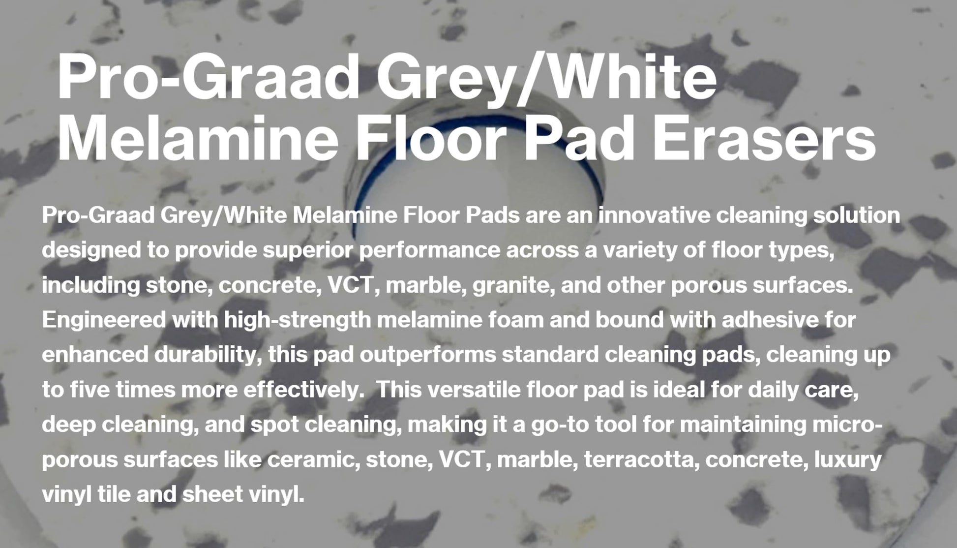 Pro-Graad Grey/White Melamine Floor Pads are an innovative cleaning solution designed to provide superior performance across a variety of floor types, including stone, concrete, VCT, marble, granite, and other porous surfaces. Engineered with high-strength melamine foam and bound with adhesive for enhanced durability, this pad outperforms standard cleaning pads, cleaning up to five times more effectively. This versatile floor pad is ideal for daily care, deep cleaning, and spot cleaning, making it a go-to tool for maintaining micro-porous surfaces like ceramic, stone, VCT, marble, terracotta, concrete, luxury vinyl tile and sheet vinyl. The pad's open-cell structure allows it to tackle ingrained dirt and stubborn scuff marks with ease, creating an eraser-like effect on black marks. It works efficiently with or without cleaning chemicals, offering a versatile option that reduces the need for additional cleaning substances. The Pro-Graad Melamine Floor Pad is compatible with various cleaning equipment, including swing machines, rotary floor machines, and low-speed automatic scrubbers, fitting all standard pad holders. Designed for wet applications, it can be used with just water or a mild detergent for more challenging stains. Its one-sided design, featuring a non-woven backing, ensures a secure grip under the machine during operation. In addition to its cleaning efficiency, the Pro-Graad Melamine Floor Pad is reusable and offers a long lifespan, consistently producing a smooth, glossy finish on floors. To maintain optimal performance, the pad can be rinsed with water to remove soil and debris as needed. However, it's important to avoid using it with high or low pH cleaners or products containing chlorine, as these may affect its durability.