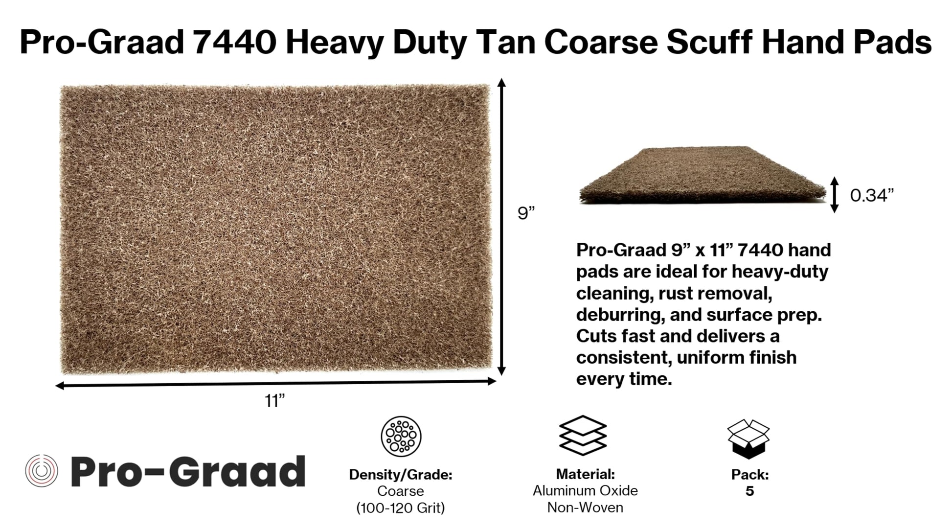 The Pro-Graad 7440 Heavy-Duty Hand Pads are built to handle the toughest cleaning, finishing, and surface preparation tasks with ease. Designed for professional performance, these industrial-grade pads provide the aggressive cutting power needed for demanding jobs while maintaining durability and consistency. Each pad measures an extra-large 9” x 11”, giving you more coverage for larger workpieces and reducing the time spent on big projects. For smaller or detailed tasks, simply cut the pads down to your desired size—offering maximum flexibility in a single product. Constructed with medium-grade aluminum oxide abrasives and a dense non-woven structure, the Pro-Graad 7440 pads deliver fast, efficient cutting action that removes rust, corrosion, adhesives, and coatings without compromising the base material. Unlike steel wool, these pads will never shred, splinter, or rust—providing a cleaner, safer, and longer-lasting solution. Designed for versatility, the pads can be used by hand, with a hand pad block, or mounted on an in-line sander, making them ideal for both flat surfaces and contoured or hard-to-reach areas. Whether you’re restoring aluminum, deburring metal, cleaning machinery, or preparing a surface for painting or welding, these pads produce a uniform, professional finish every time. This 5-pack set ensures you always have pads on hand for shop work, maintenance, and industrial applications. With their load-resistant design and extended lifespan, Pro-Graad 7440 9x11 Hand Pads are the smart, dependable choice for professionals and serious DIYers who demand speed, durability, and results without compromise.